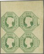 1847/54: Embossed 1 s. green, Die 2, an unused corner marginal block of four from top right of the sheet, large margins all round, very clear and sharp embossing, vertical bend at left; minor soiling on face visible on the neck and bust of the Queen and some slight surface rubbing due to attempts to remove same, otherwise of wonderfully fresh appearance and with near full original gum. The sole recorded block of four from Die 2, with just the two blocks known from Die 1 - one of which was recently sold at Corinphila (sale 349, lot 4133) and is not as attractive as this multiple - a unique and outstanding Exhibition piece for the connoisseur. Cert. Karl Louis (2023) Gi Spec H1(2) = £ 125'000. Provenance: Collection Michael Lea (1970's); collection Major General Sir Leonard Atkinson, Christies, London, 6 Nov 1990, lot 340; collection Sir Gawaine Baillie, Sotheby's, London, 29 Sept 2004, lot 209.