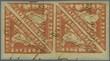 1861 (March 7): 1 d. carmine on laid paper, the famous block of four, very fine used on piece (Row 2, Stamps 13-14-15-16) with margins nearly all round: one stamp just touched at corner, large to enormous margins on three sides, slight ironed crease on the left hand pair and in the margin between the pairs, neither affecting the appearance, cancelled by light strikes of the CGH obliterator in black. Illustrated in "The Triangular Stamps of the Cape of Good Hope" by D. Alan Stevenson on plate 16 and in the London 1970 'Philympia' Exhibition catalogue. A rare and extraordinary multiple, just two blocks are recorded, these being largest recorded multiples Gi = £ 16'000++. Note: Certified as genuine by RPSL in 1948 # 32,217, the certificate is not present with the lot. Provenance: Collection D. Alan Stevenson, Harmers, London, 6-7 Nov 1950, lot 188; collection Col. W. D'Arcy Hall, Harmers, London, 5 Nov 1962, lot 133; collection H.E. Levitt, collection Sir Maxwell Joseph, Sotheby's, London, 28-29 Oct 1982, lot 715; collection "Maximus", Sotheby's, London, 7 Sept 1989, lot 369; collection "Bonaventure", Christie's, London, 9 Sept 1993, lot 265; collection Mrs. Ad Indhusophon, Spink, London, 26 May 1999, lot 150.
