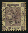 香港維多利亞女皇像改值5仙蓋18仙舊票,銷珍罕之瓊州英局Webb B型日戳,日期為1881年3月7日。為Webb記錄之13例中最晚一例。附皇家郵學會證書。