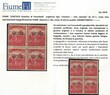 10 f. con sovr. a macchina n. 8a in eccezionale quartina, fresca e ben dentellata. I 2 es. inferiori con gomma integra. Rarissima, forse unica (cert. Fiumefil). (15000)